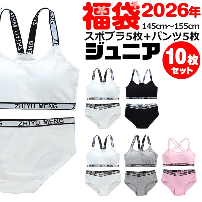 トップ > ジュニア > 下着 > 2026年福袋 【訳あり】正午まで当日発送(土日祝除く) 送料無料 子供下着セット スポーツブラとパンツ10点セット カップ付き 下着 女の子 肌着 145cm〜155cm 12才〜14才 無地 ブラック/グレー/ホワイト/ピンク スポブラ ショーツ パンツ 綿