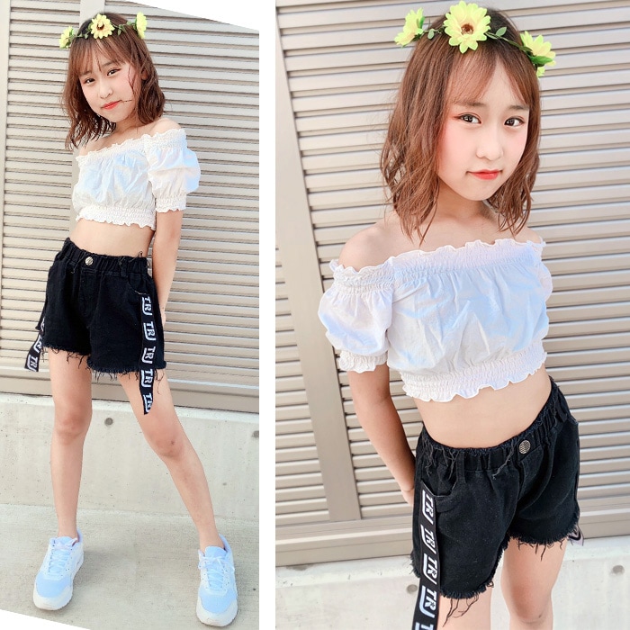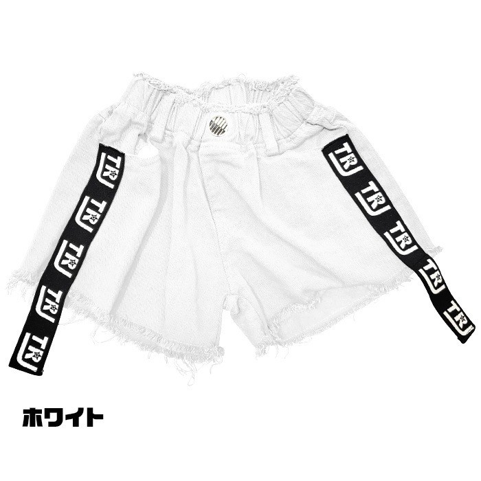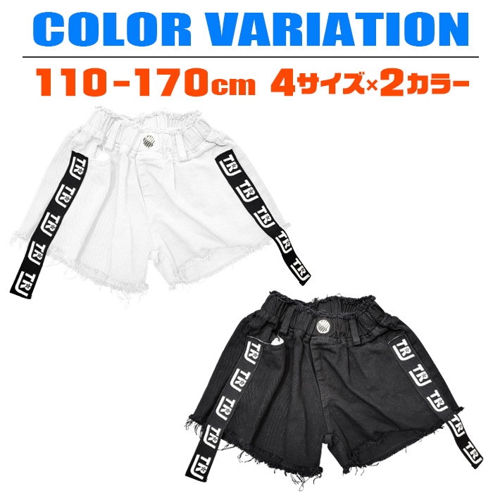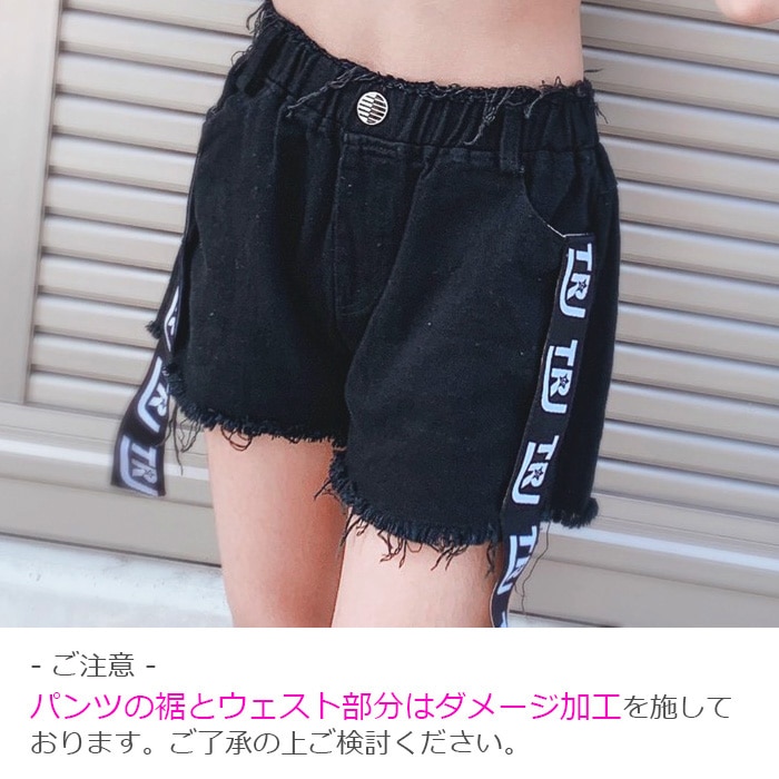 3〜5営業日で発送予定★TRJオリジナル★ショートパンツ ダメージデニム 女の子 子供服 キッズ 無地 ロゴリボン ブラック/ホワイト 110cm〜170cm ダンス衣装 ヒップホップ ダンスパンツ ジュニア ガールズ ステージ衣装 デニム ビーチパンツ