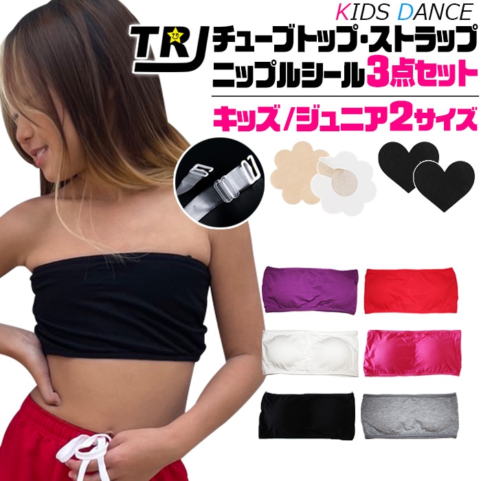 正午まで当日発送(土日祝除く)3点セット ダンス チューブトップ 透明ストラップ ニップルシール スポーツブラ パット付き 女の子 子供服 キッズ 無地 小学生 中学生 ダンス衣装 ヒップホップ 見せブラ 低学年 高学年 タンクトップ