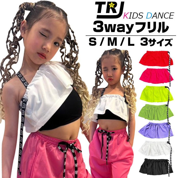 3〜5日で発送予定 フリルトップス 3way オフショル ワンショルダー ミニスカート チューブトップ S M L 女の子 子供服 キッズ 無地 ロゴ ネオンカラー ブラック ホワイト レッド ピンク パープル グリーン イエロー ヒップホップ 重ね着