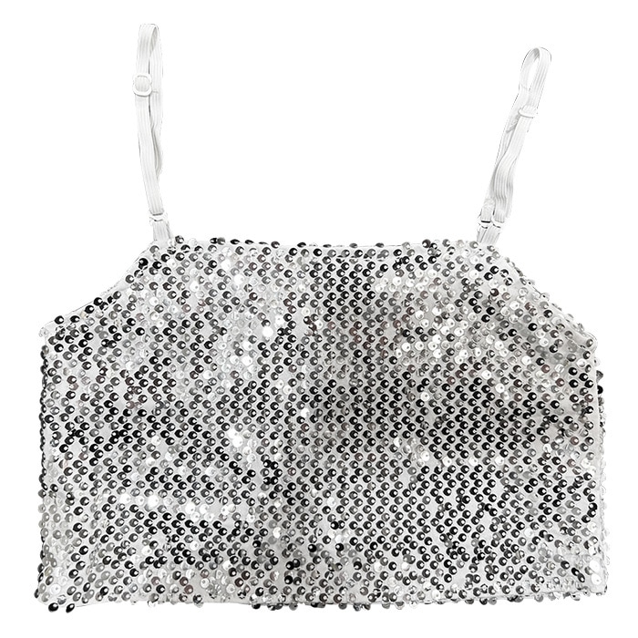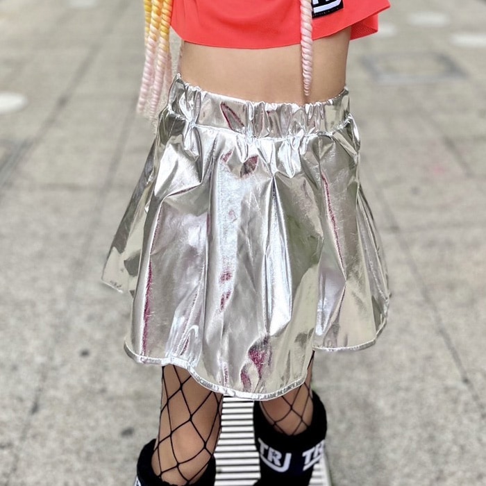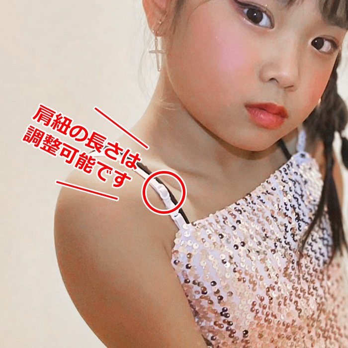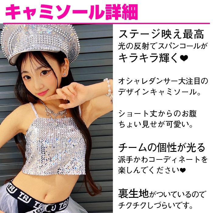 商品名 : 3〜5日で発送予定(土日祝除く)キッズ ダンス 衣装 セットアップ ステージ衣装 上下3点セット キャミソール フレアスカート チュチュスカート スパンコール パニエ 100cm〜150cm 3サイズ 無地 女の子 キッズ 銀色 ガールズダンス ヒップホップ