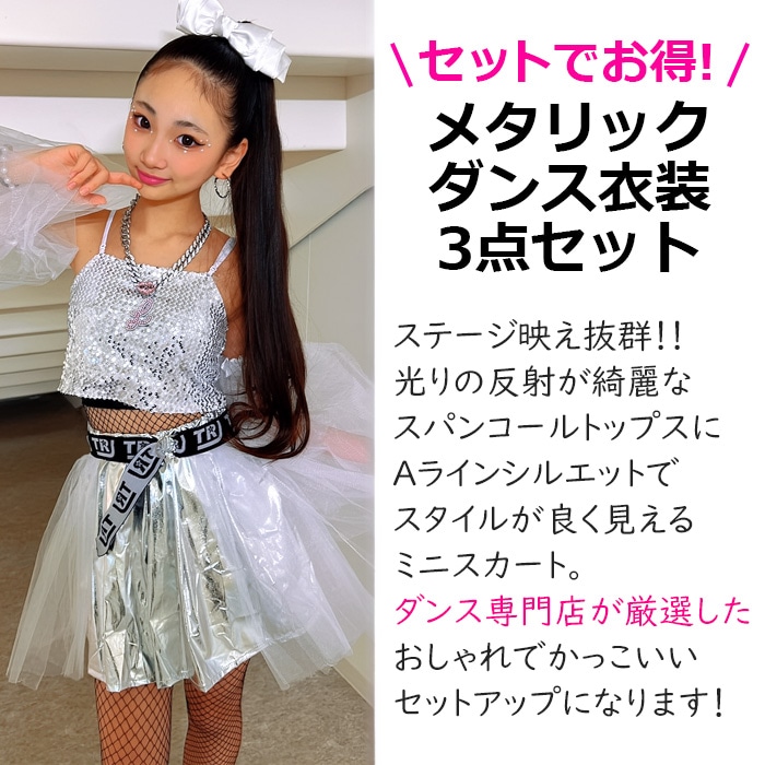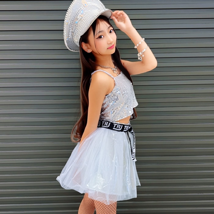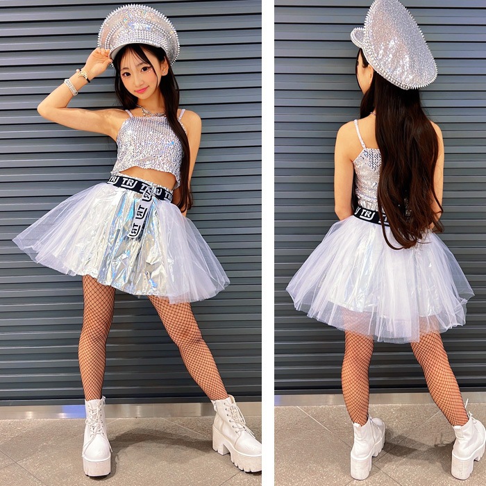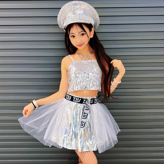 3〜5日で発送予定(土日祝除く)キッズ ダンス 衣装 セットアップ ステージ衣装 上下3点セット キャミソール フレアスカート チュチュスカート スパンコール パニエ 100cm〜150cm 3サイズ 無地 女の子 キッズ 銀色 ガールズダンス ヒップホップ