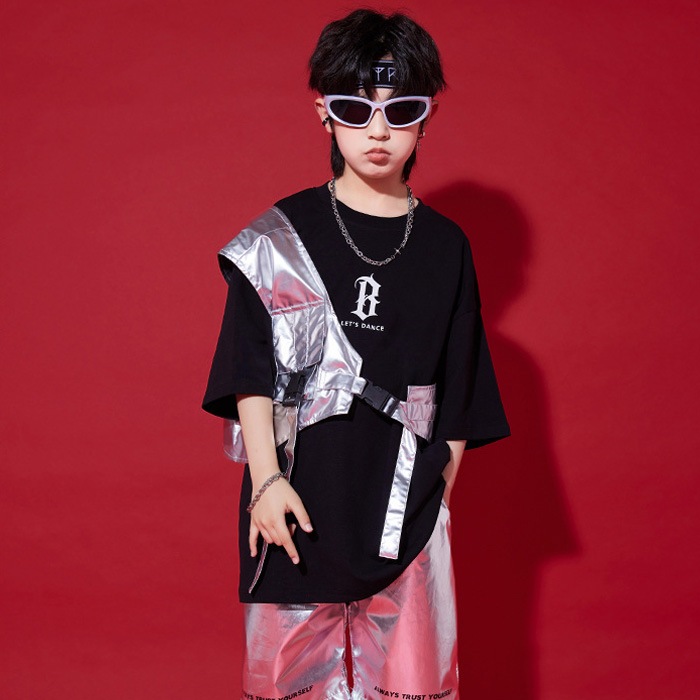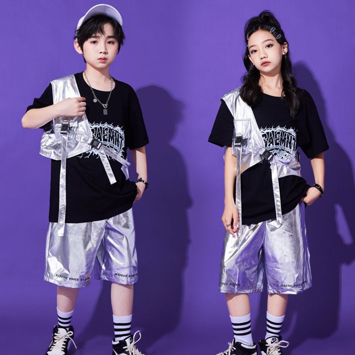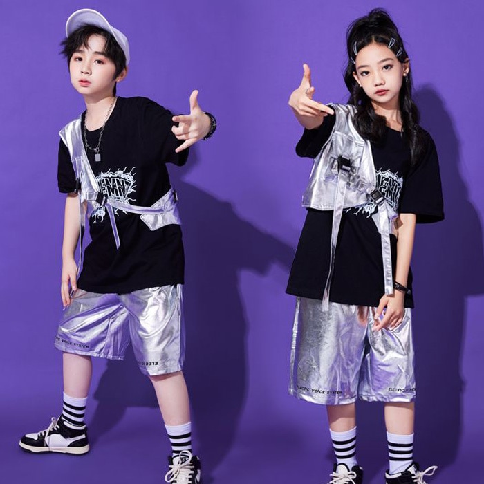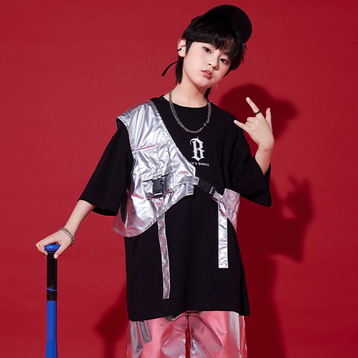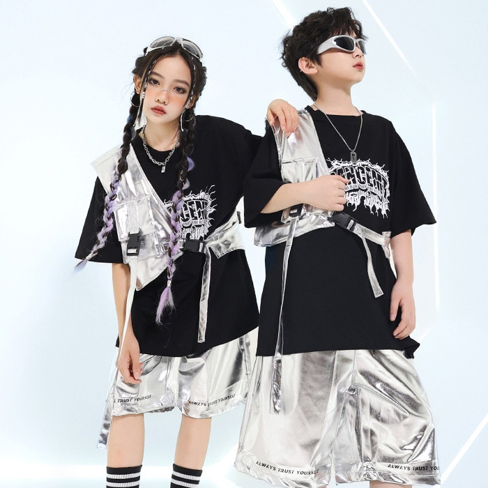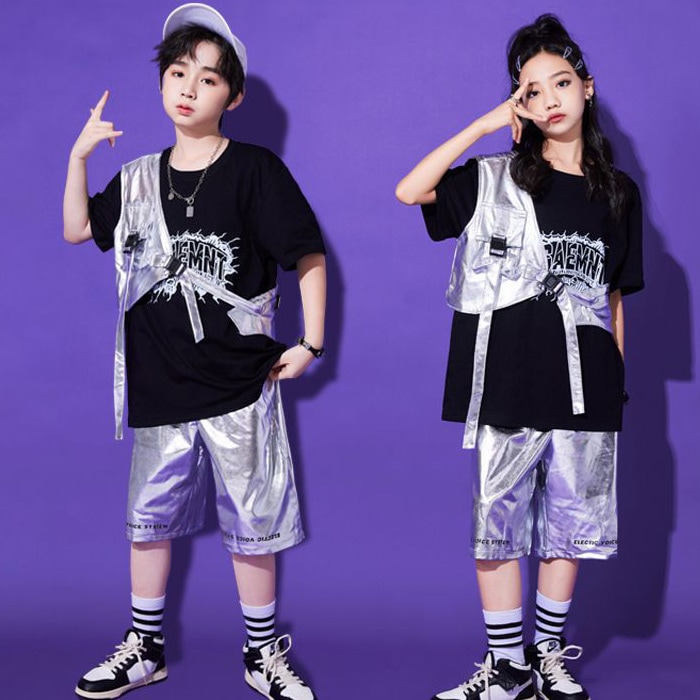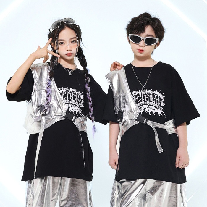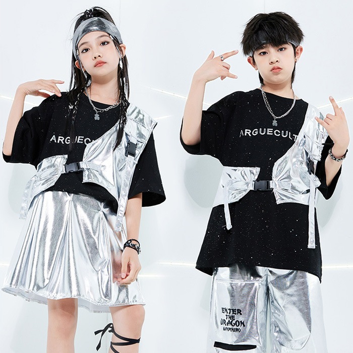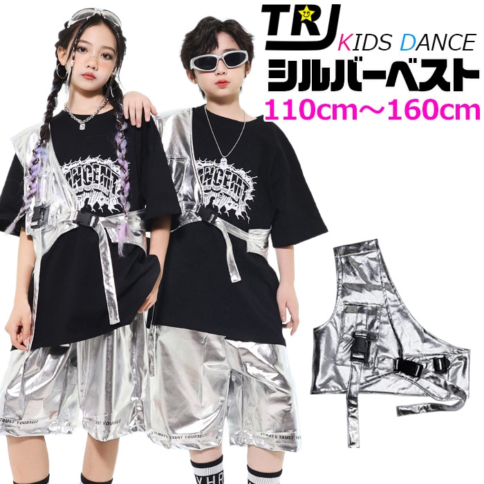 正午まで当日発送(土日祝除く)メタリックベスト アシンメトリー ショート丈 シルバー 男女MIX キッズ ダンス衣装 110cm 120cm 130cm 140cm 150cm 160cm 子供服 銀色 女の子 男の子 キラキラ かっこいい ロックダンス ステージ衣装 ヒップホップ