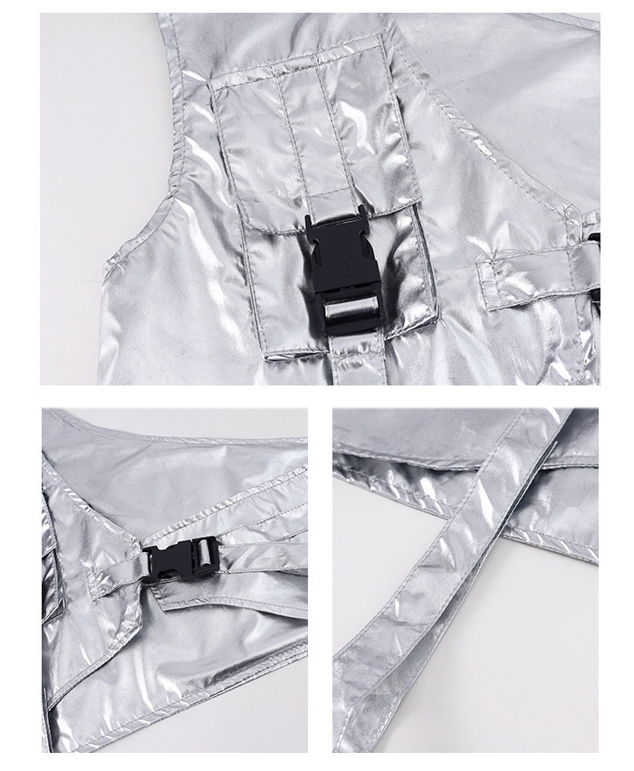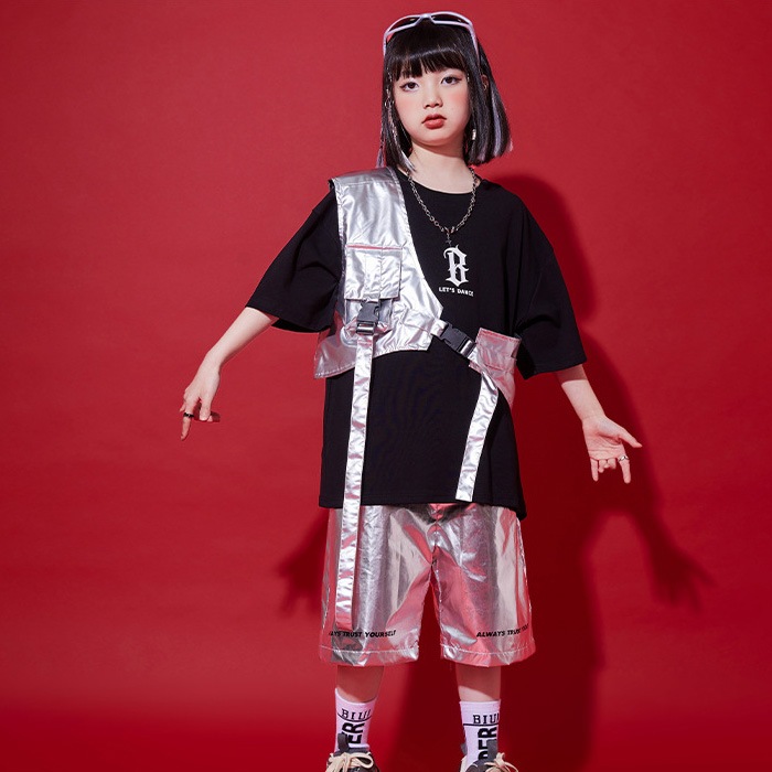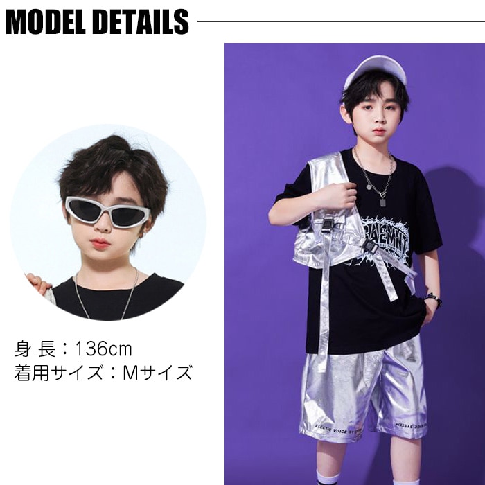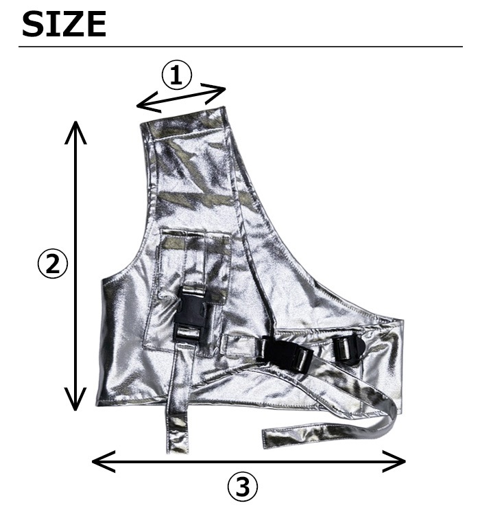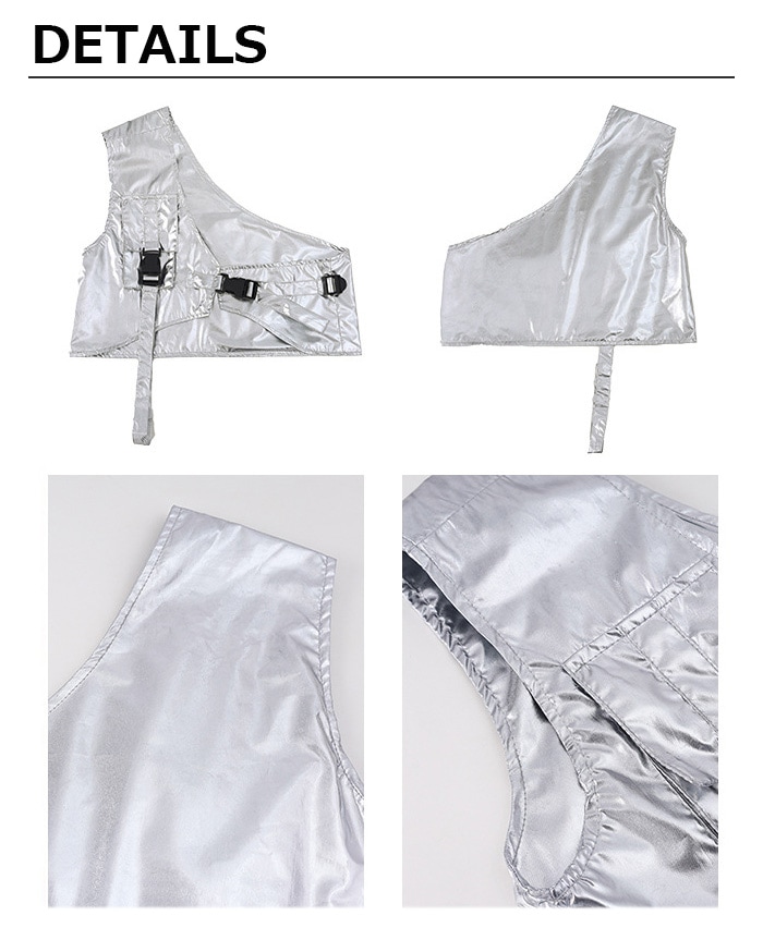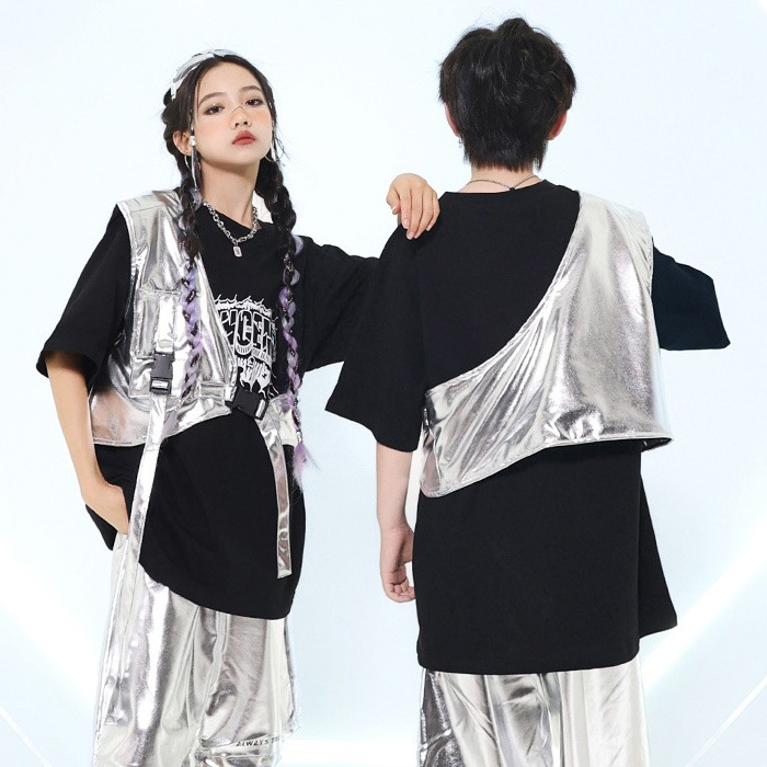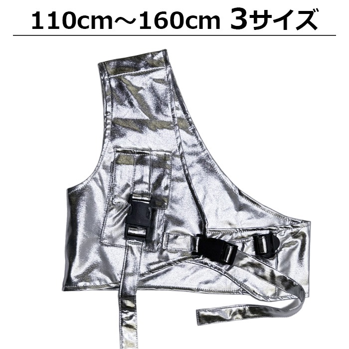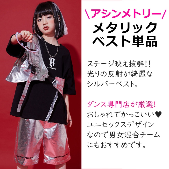商品名 : 正午まで当日発送(土日祝除く)メタリックベスト アシンメトリー ショート丈 シルバー 男女MIX キッズ ダンス衣装 110cm 120cm 130cm 140cm 150cm 160cm 子供服 銀色 女の子 男の子 キラキラ かっこいい ロックダンス ステージ衣装 ヒップホップ