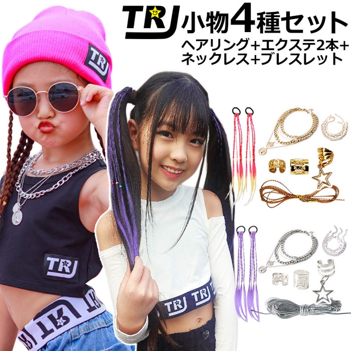 正午まで当日発送(土日祝除く)送料無料 ダンスコーデ 4種セット 5連ネックレス+3連ブレスレット+ヘアリング36個セット+エクステ2本 ブレイズビーズ 女の子 キッズ 子供用 ゴールド シルバー ダンス衣装 ヒップホップ ヘアアクセサリー