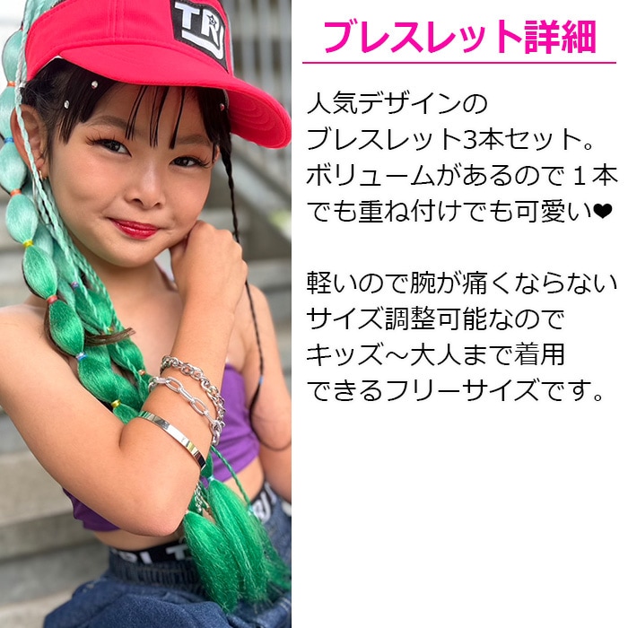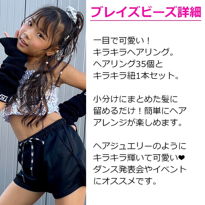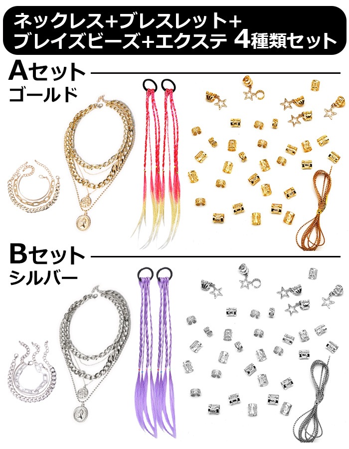 商品名 : 正午まで当日発送(土日祝除く)送料無料 ダンスコーデ 4種セット 5連ネックレス+3連ブレスレット+ヘアリング36個セット+エクステ2本 ブレイズビーズ 女の子 キッズ 子供用 ゴールド シルバー ダンス衣装 ヒップホップ ヘアアクセサリー
